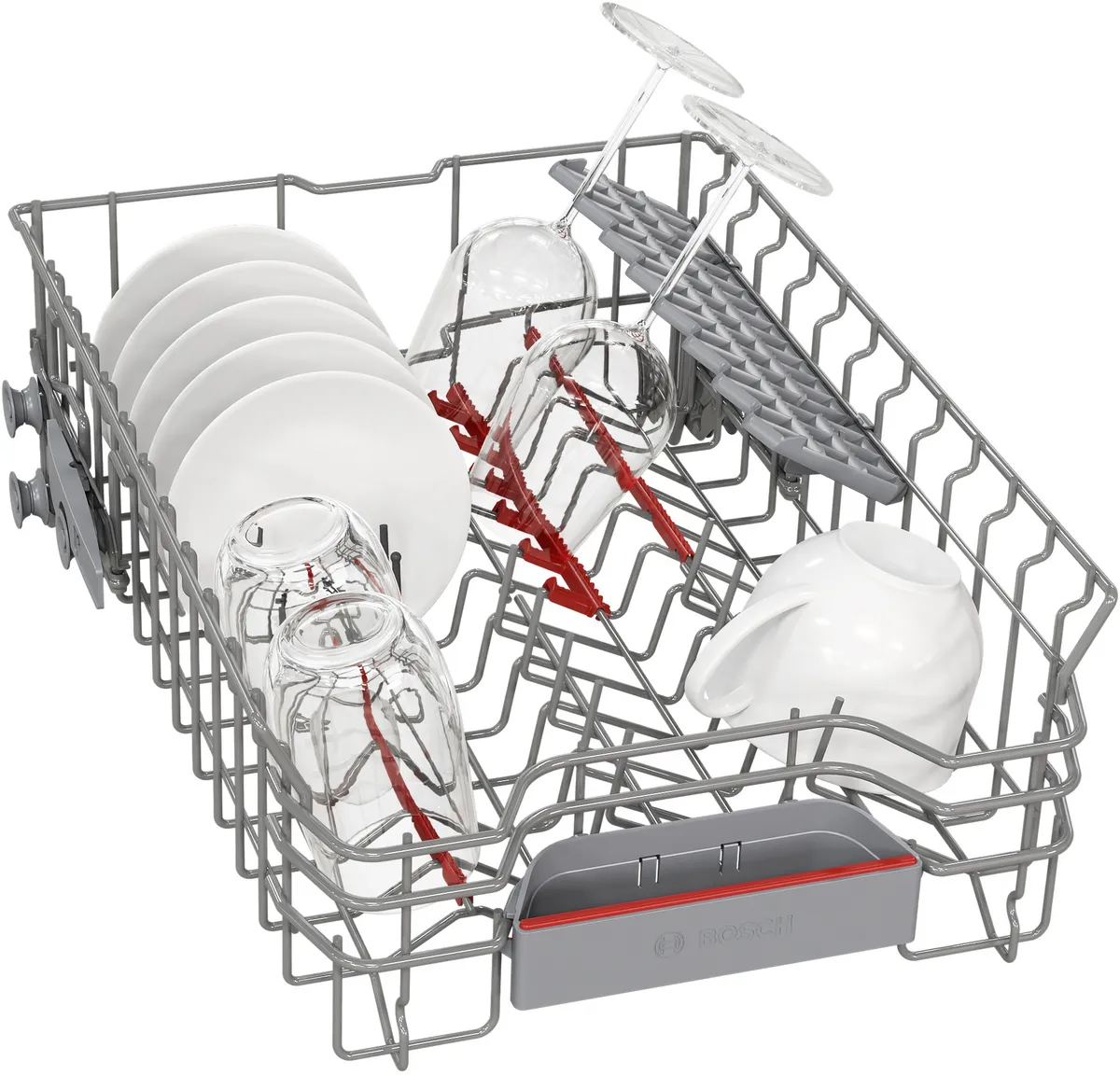 Благодаря трехступенчатой системе Rackmatic верхняя корзина регулируется в три этапа с шагом до 5 см одним движением. И это возможно даже при полной загрузке. Будь то тарелки для пиццы или бокалы на длинной ножке – дополнительное пространство гибко создается сверху или снизу для высоких предметов.