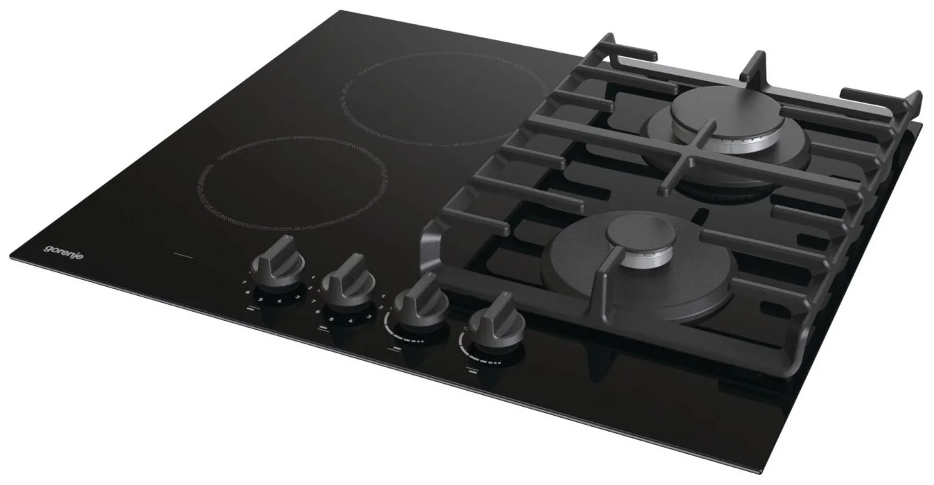 Независимая комбинированная варочная панель Gorenje GCE691BSC работает одновременно на газе и от электрической сети. Это позволяет пользоваться теми конфорками, которые нужнее в данный момент. Конфорки на поверхности разделены пополам. В правой части находятся две электрические конфорки, в левой — газовые. Зоны нагрева также отличаются по мощности.