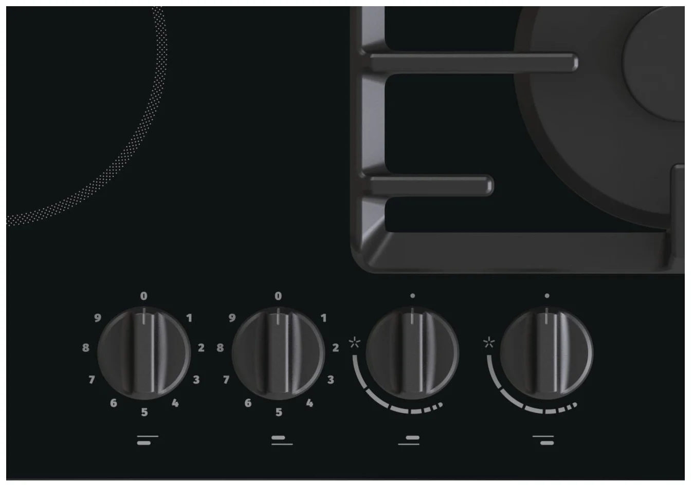 Газовые горелки рассчитаны на работу со сжиженным газом, в комплекте есть форсунки для природного. Электроподжиг в панели автоматический. Есть система газ-контроля — если конфорка случайно погаснет, датчик подаст сигнал, и топливо перестанет поступать. Электрические конфорки оснащены индикацией остаточного тепла.