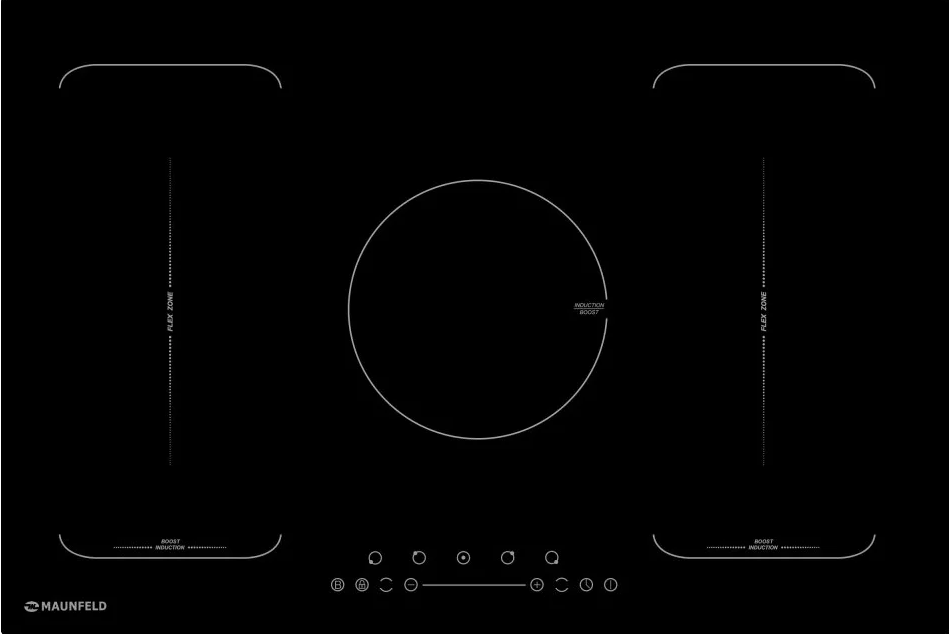 Диаметр самой большой конфорки, расположенной по центру плиты составляет 210 мм. Остальные 4 конфорки имеют 180 мм в диаметре. Две конфорки мощностью 1500 Вт (бустер 2000 Вт) и три мощностью 2000 Вт (бустер 2600 Вт). Вы можете объединить 2 варочные зоны в «Flex Zone» с мощностью 2500 Вт (бустер 2800 Вт).