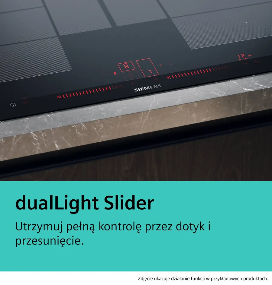 dualLight Slider – Просто коснитесь и проведите пальцем по варочной панели, чтобы управлять ею. Логичное расположение двух ползунков позволяет легко выбирать конфорки по обеим сторонам варочной панели. Просто коснитесь и сдвиньте ползунок, чтобы отрегулировать температуру. А когда варочная панель выключена, индикаторы исчезают, оставляя гладкую и минималистичную поверхность из черного стекла.