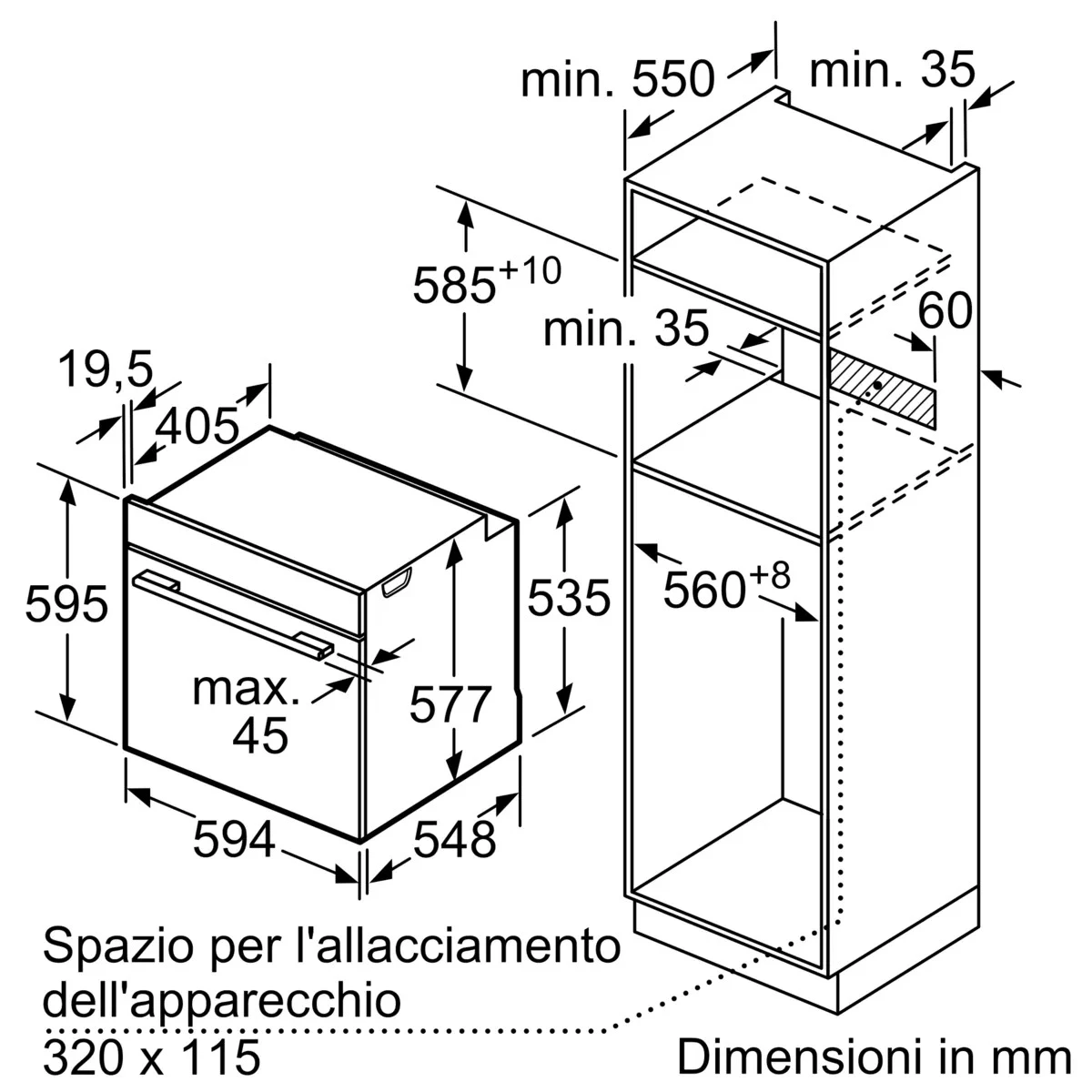 Размеры ниши для встраивания (ВхШхГ): 595 мм x 568 мм x 550 мм