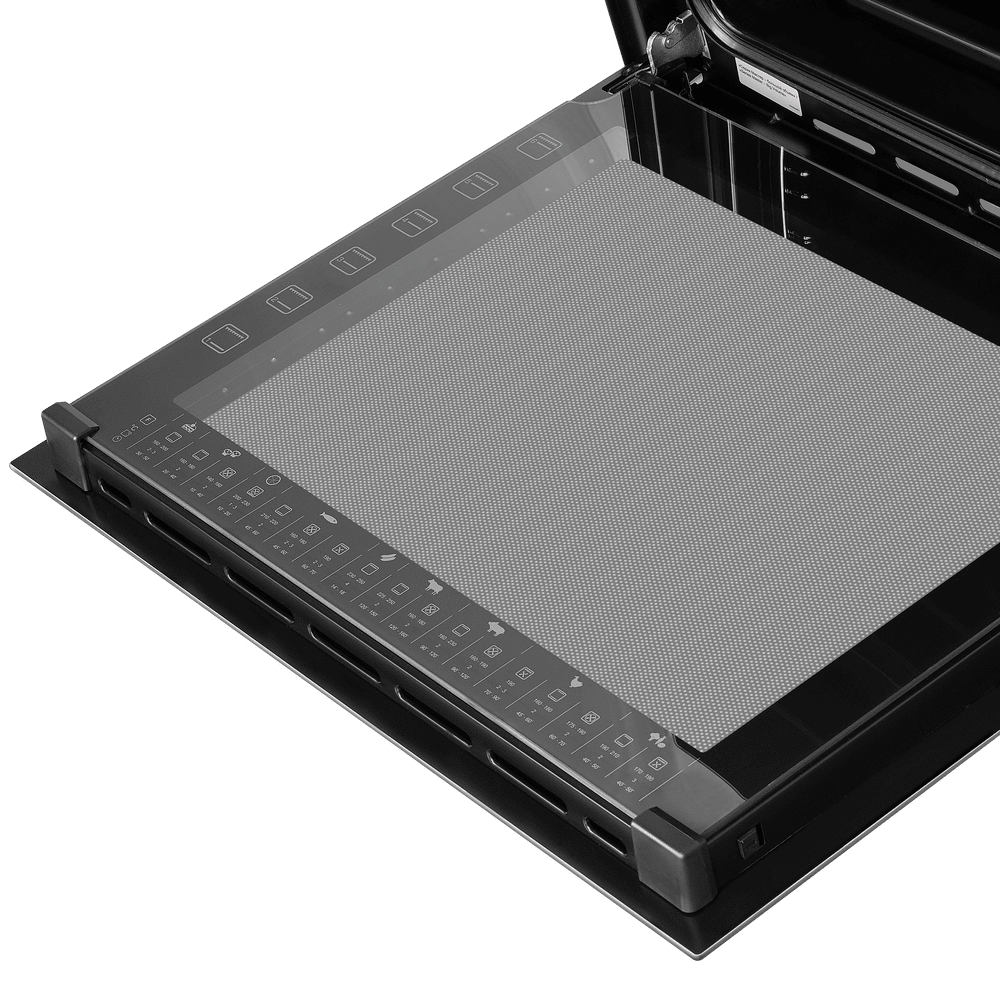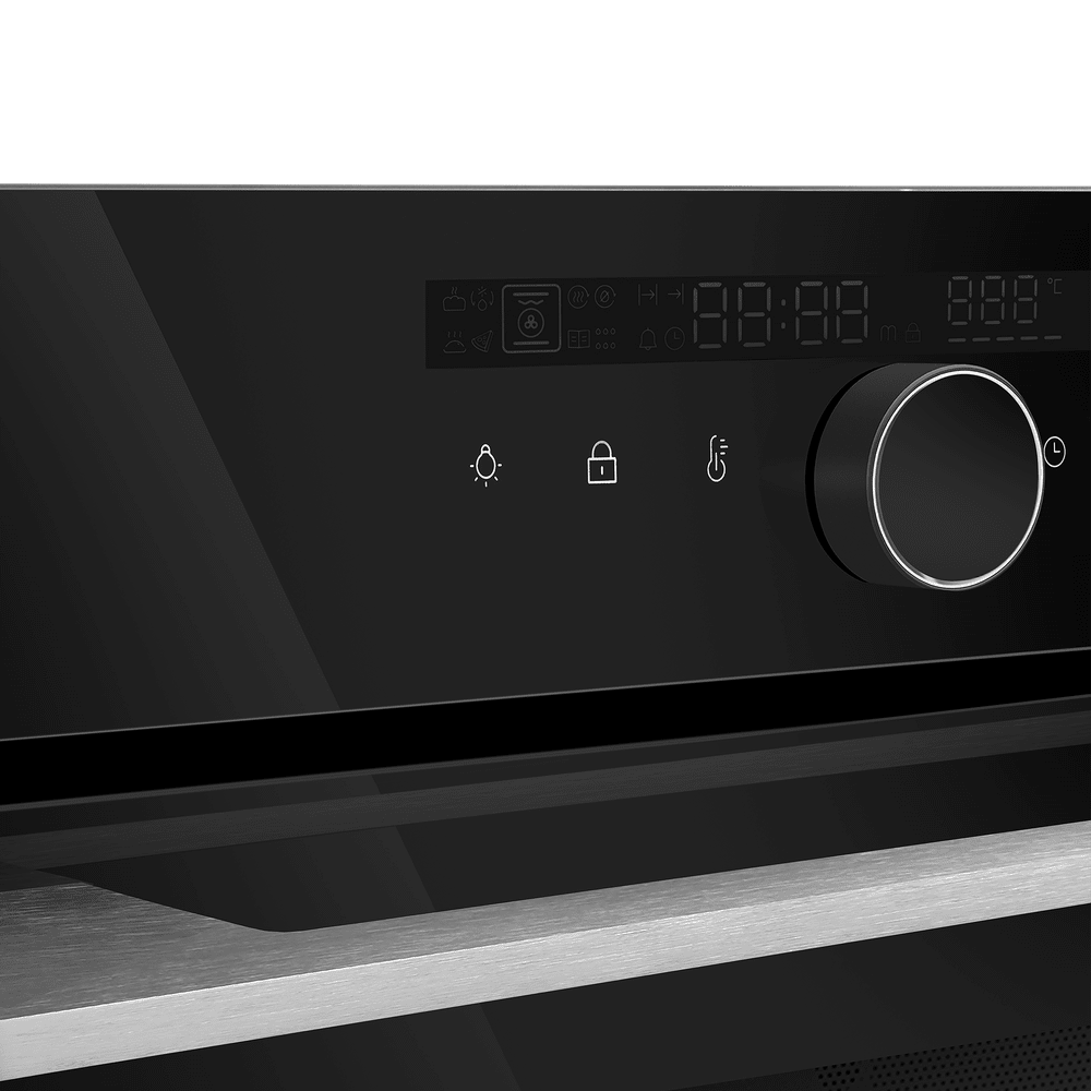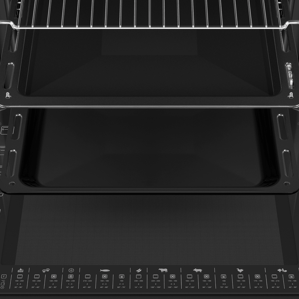 Объем 76 л при стандартных размерах 60 см позволяет готовить одновременно несколько блюд, разместив решетку или противень на одном из 6 уровней боковых направляющих. Два уровня оснащены удобными телескопическими направляющими. Внутреннее покрытие камеры выполнено из специальной легкоочищающейся эмали черного цвета.