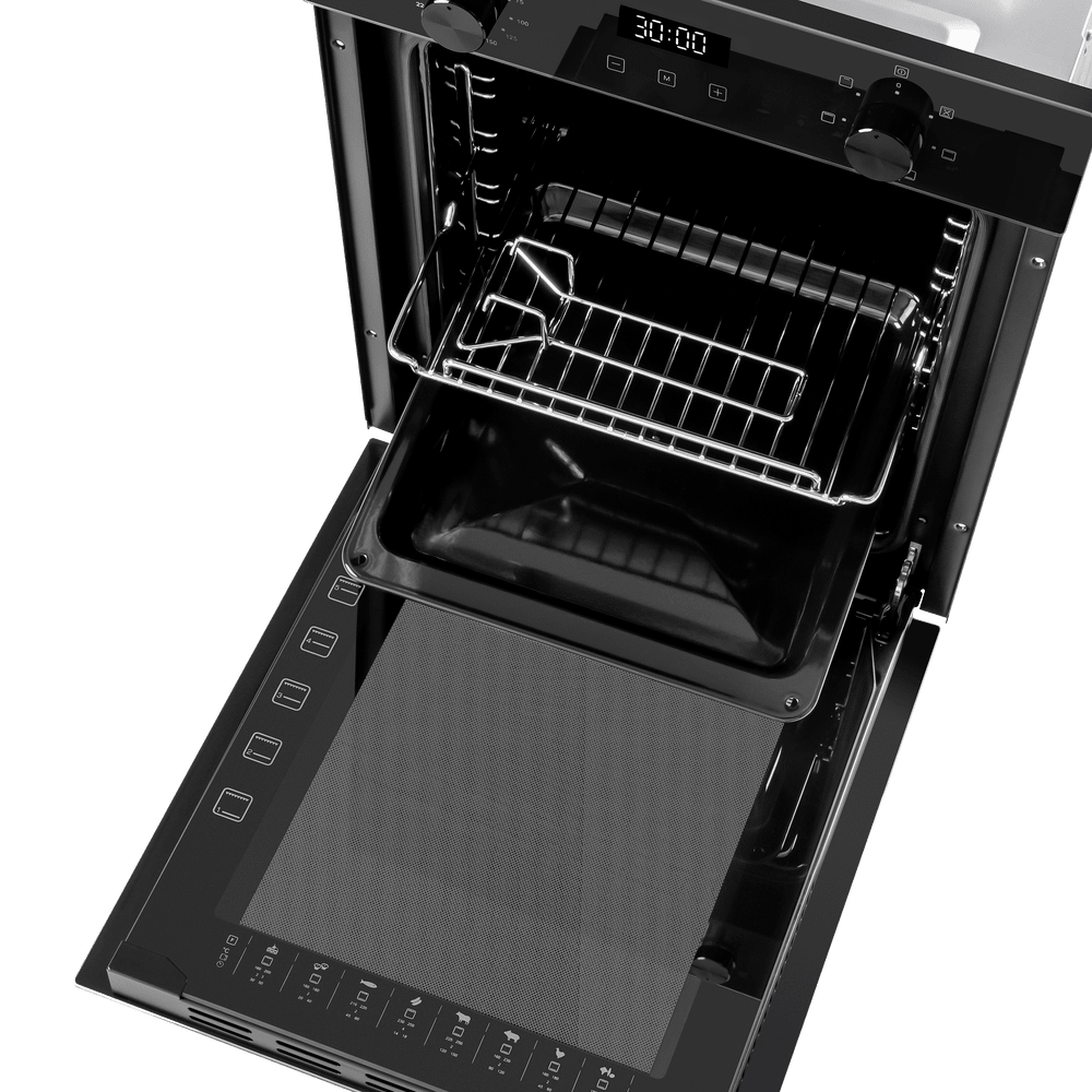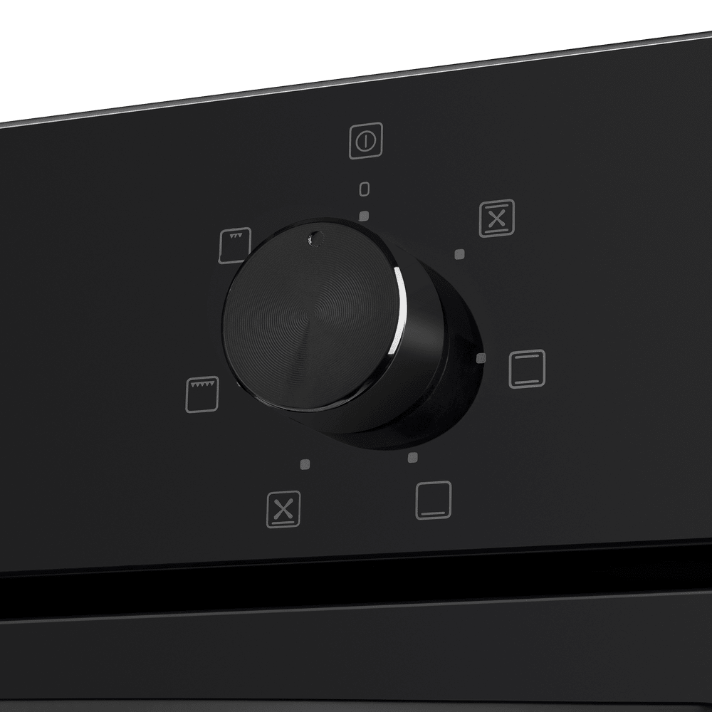 Комбинированное управление реализовано с помощью сенсорного дисплея и цельнометаллических поворотных ручек. Можно установить таймер, выбрать температуру (50°-250°C) и один из 7-ми режимов работы: внутреннее освещение, традиционный нагрев, большой гриль, конвекция с нижним нагревом, нижний нагрев, конвекционный нагрев, малый гриль.