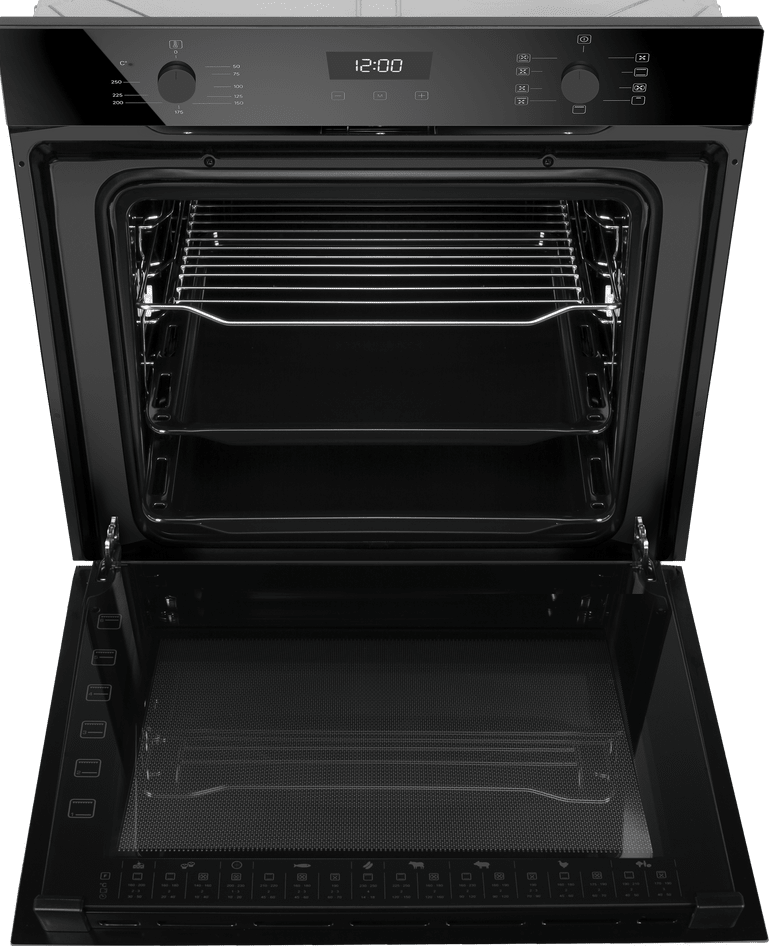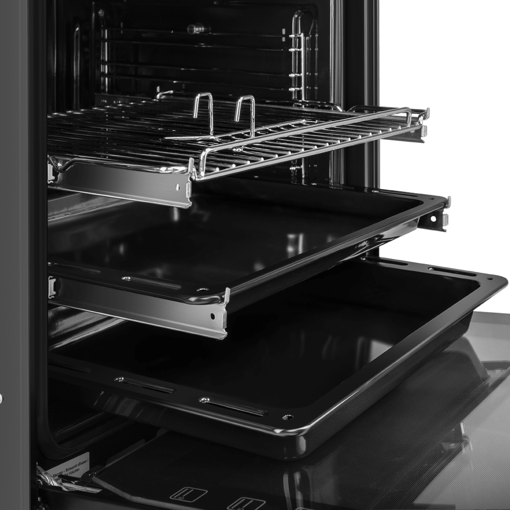 Объем 76 л при стандартной ширине 60 см позволяет готовить одновременно несколько блюд, разместив решетку или противень на одном из 6-ти уровней боковых направляющих. Два уровня оснащены удобными телескопическими направляющими. Внутреннее покрытие камеры выполнено из специальной легко очищающийся эмали черного цвета.