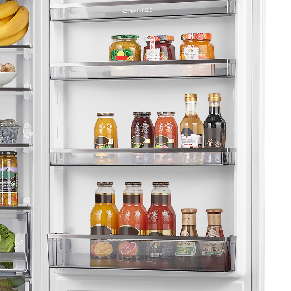 Полки оснащены стильными металлическими фреймами. Это не только декоративный элемент, придающий холодильнику современный вид: фреймы защищают от трещин и сколов, а также препятствуют стеканию жидкостей в случае их пролития.