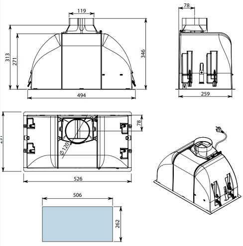 Работу прибора обеспечивает мотор с максимальной производительностью 1040 м³/ч. Уровень шума при этом не превышает 65 dbA. Предусмотрено три скоростных режима, переключить которые можно с помощью кнопок Soft touch, расположенных на передней панели. Здесь также находится кнопка полного отключения вытяжки и включения подсветки. Управление электронное. Для комфортного освещения рабочей поверхности использованы две светодиодные лампы мощностью 1.2 Вт и диапазоном цветовой температуры в 3200 К. Этим лампам не потребуется замена, поскольку их ресурс сопоставим со сроком эксплуатации прибора.